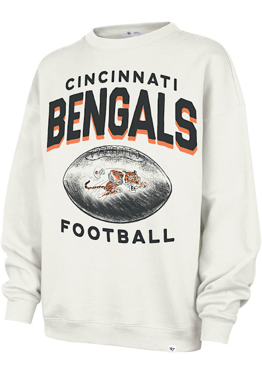 Make your way to the big game in this Cincinnati BengalsWomens White Arch Crew Sweatshirt! This Bengals Long Sleeve Sweatshirt features a center front vintage screen print team name and logo. Stay warm and comfortable with this Womens Cincinnati Bengals Crew Sweatshirt.