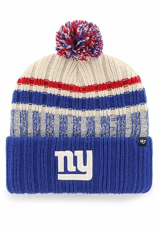 Show off your team pride and style in this New York Giants 47 Blue Long Range Cuff Pom Knit Hat! This New York Knit Hat features a front embroidered team cuff logo, so now everyone will know how much you love your Giants. Go Giants!