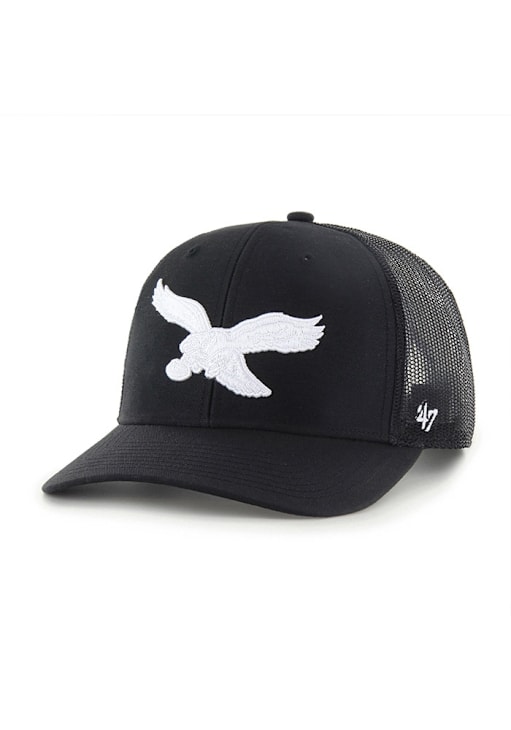Product Details Product Details 47 Brand Trucker W/Strap BlackFront embroidered team logoMatching crown and visorTrucker mesh on back and side panelsSide 47 logoHook and loop strap closureCOTTON/POLY BLENDCurved BillLow CrownStructuredWipe clean with cloth or cleaning kitImported Officially Licensed This Philadelphia Eagles Black Adjustable Hat features a front embroidered team logo on a matching structured crown and visor with contrast meshback.
