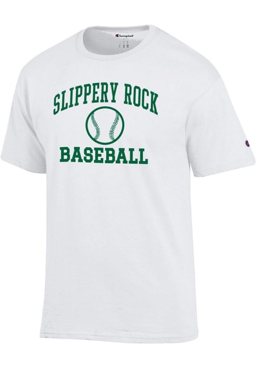 Show off your team pride in this Champion Slippery Rock White Baseball Jersey Short Sleeve T Shirt! This Slippery Rock Short Sleeve Tee features a printed team graphic. Make sure everyone knows you root for the Rocky with this White Slippery Rock T Shirt. Go Rocky!