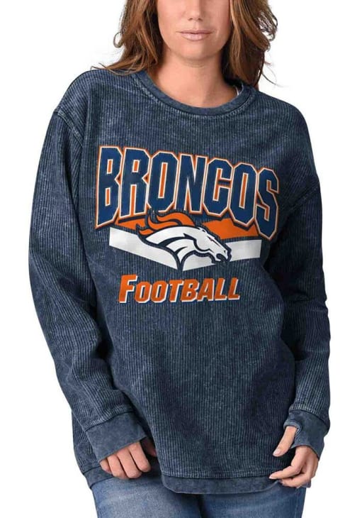 Make your way to the big game in this Denver BroncosWomens Navy Blue Cozy Cord Crew Sweatshirt! This Broncos Long Sleeve Sweatshirt features a center front screen print team name and logo. Stay warm and comfortable with this Womens Denver Broncos Crew Sweatshirt.
