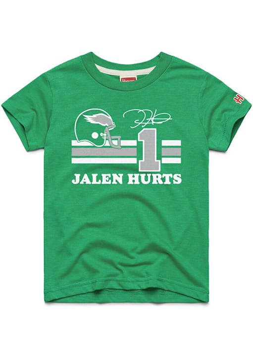 Product Details Product Details Soft, tri-blend materialLightweight materialScreen print player name and numberCrew necklineShort sleeveHomage logo on left sleevePerfect for any young sports fanTRI-BLEND Officially Licensed Let your little Eagles fan show support for their favorite player in this Youth Jalen Hurts Short Sleeve Player Tee. This Kelly Green Short Sleeve Player T-Shirt features a screen print player name and number.