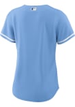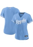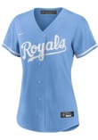This Womens Kansas City Royals Replica Jersey is designed to give an on-field look at a superior value. This Light Blue Baseball Jersey delivers comfort and breathability in a lighter wicking fabric for a genuine game-ready look. You'll be the best-looking fan in the stadium when you pull on this KC Royals Replica Jersey, which features a twill team wordmark across the front, player name and number on the back, replica team markings, MLB logo on back below the neck, locker tag at left lower hem, Swoosh at right chest. Go Royals!