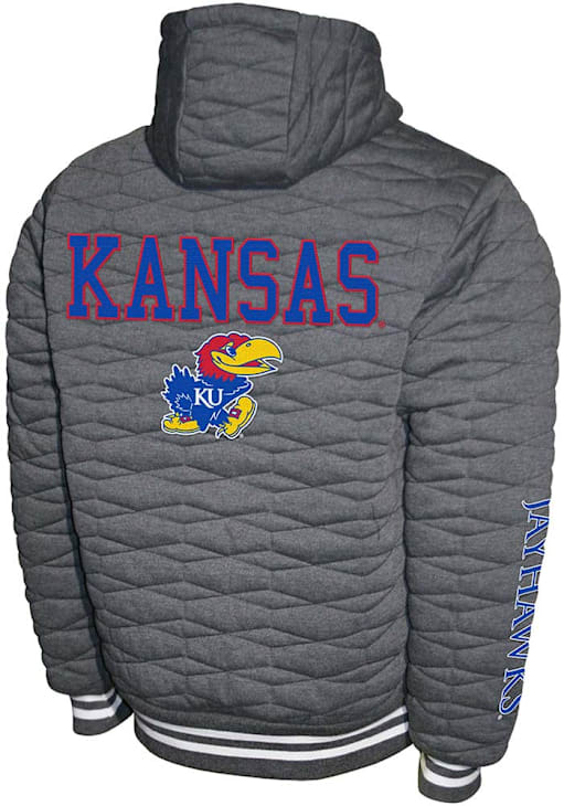 Product Details Product Details Polyester lining with poly fillHoneycomb quilted shell and hoodConcealed zippers on frontPouch front pocketsZippered chest pocket100% POLYESTER Officially Licensed Add a layer to your gameday look with this Kansas Jayhawks Charcoal H-Quilt Hooded Fleece Medium Weight Jacket! Stay warm in cooler weather as you cheer on the Jayhawks in this great . With a embroidered and appliqué team logo on left chest, logo and wordmark on back and left sleeve, you'll be the most comfortable and stylish fan at the game.
