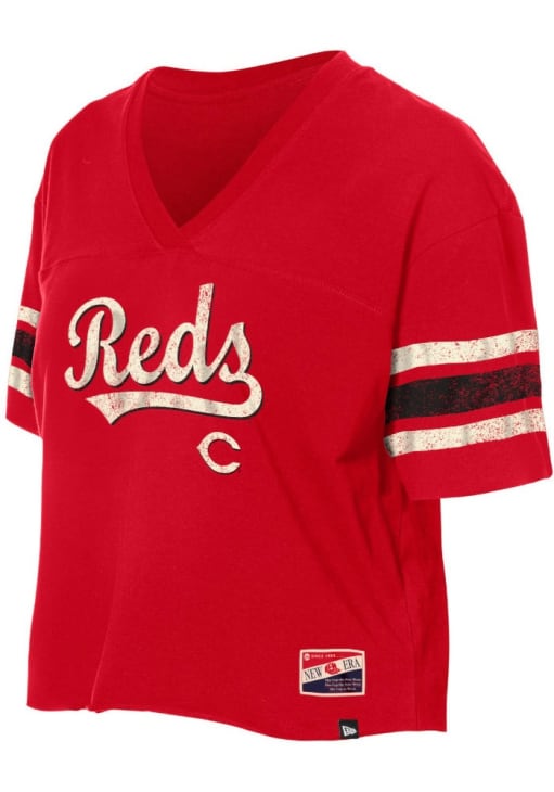 Product Details Product Details Slight drop shoulderStraight hemBreathableSoft to touchRelaxed Fit93% COTTON / 7% SPANDEXV NeckCrop Above HipImport, Domestic Officially Licensed Let everyone know who you root for in this Cincinnati Reds Red Raw Short Sleeve T-Shirt! This Cincinnati Reds Short Sleeve Tee features a center front screen print team name and logo.