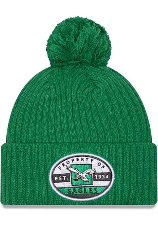 Show off your team pride and style in this Philadelphia Eagles New Era Green Property Cuff Pom Knit Hat! This Philadelphia Knit Hat features a front embroidered fabric applique, so now everyone will know how much you love your Eagles. Go Eagles!