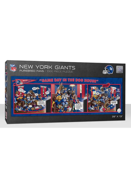 Product Details Product Details 3 panel pictorial comic designFeatures fun play on words3ft long when put togetherDimensions: 39” x 13”Original artwork Officially Licensed Give yourself a brain teaser with this New York Giants 1000 Piece Purebread Fans Game Day Dog House Puzzle. This Puzzle features a 1000 piece puzzle with comic design.