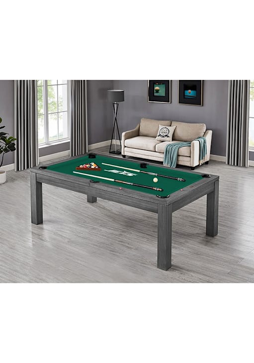 Product Details Product Details Upgrade your plain billiard cloth with your favorite teamCustom printed using high quality materialsDurable and vibrantCloth has anti-friction coatingConsistent english on ballsReduced ball marksReduced ball marks100% PolyesterUSA Officially Licensed Add a touch of class and New York Jets spirit to your game room with this New York Jets Pool Table. This Pool Table features a team logo. Go Jets!