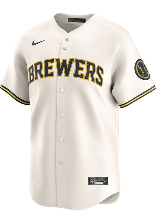 Get a piece of the Brewers action with this Milwaukee Brewers Ivory Home 2024 Limited Baseball Jersey. You'll look like one of the team as you wear this to support your Brewers. With a Short sleeve button front jersey with full chest sublimated twill team wordmark. Recycled sublimated twill front numbers, back player name & number and sleeve patch where applicable. Direct embroidery swoosh. Recycled woven heat applied front jock tag. Heat applied neck label., this Limited Baseball Jersey makes a great addition to any Brewers fan's closet.