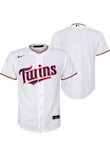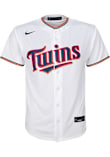 Your little Twins fan will look great cheering on the Minnesota Twins in this White Youth Baseball Jersey. This Minnesota Jersey features a twill team wordmark across the front, replica team markings, MLB logo on back below the neck, locker tag at left lower hem, Swoosh at right chest.