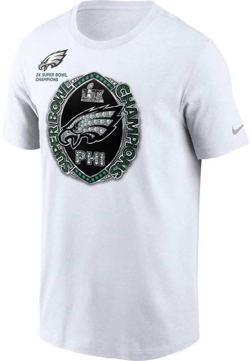 Show off your team pride in this Nike Philadelphia Eagles White 2024 Super Bowl Champions Multi Champ Short Sleeve T Shirt! This Philadelphia Short Sleeve Tee features a screen print team graphic on chest. Make sure everyone knows you root for the Eagles with this White Philadelphia T Shirt. Go Eagles!