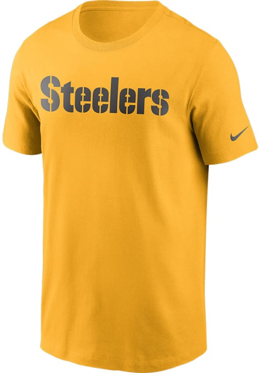 Show off your team pride in this Pittsburgh Steelers Gold Wordmark Essential Short Sleeve T Shirt! This Pitt Steelers Short Sleeve Tee features a crew neck with a team wordmark on center chest. Make sure everyone knows you root for the Steelers with this Gold Pitt Steelers T Shirt. Go Steelers!