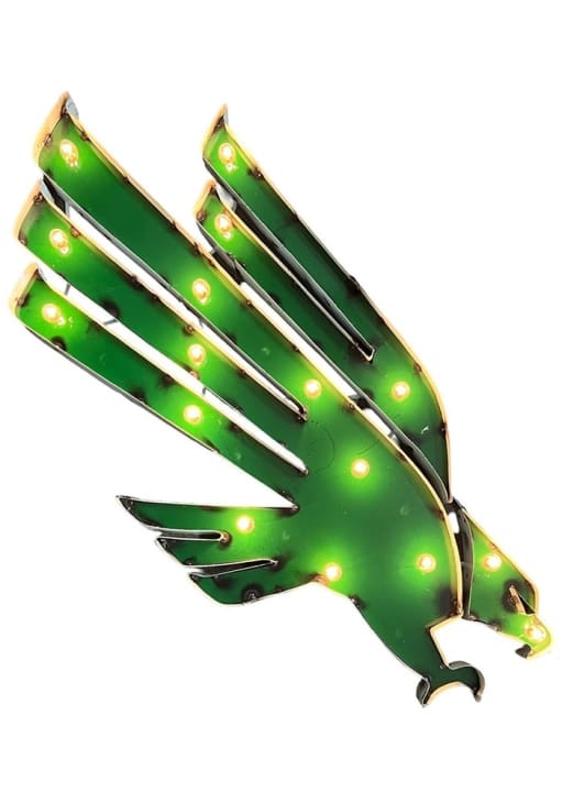 Product Details Product Details Measures approximately 31 x 15 inBuilt by handPre-strung glass lightbulbsMade of recycled metal materialSmall imperfections and exposed spot welds designMETAL Officially Licensed Light up your Mean Green game room with this North Texas Mean Green Marquee Sign. Get your game room party-ready with this Marquee Sign, which features a Team Logo on Lighted Metal.