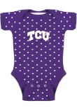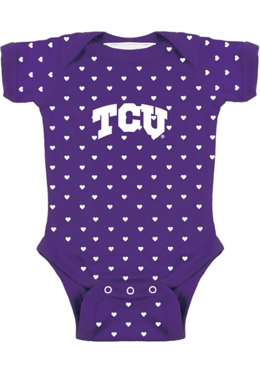 Your future Horned Frogs fan will look cute in this TCU Horned Frogs Baby Purple Heart One Piece! This Horned Frogs Romper features a heart print all over and team logo center.